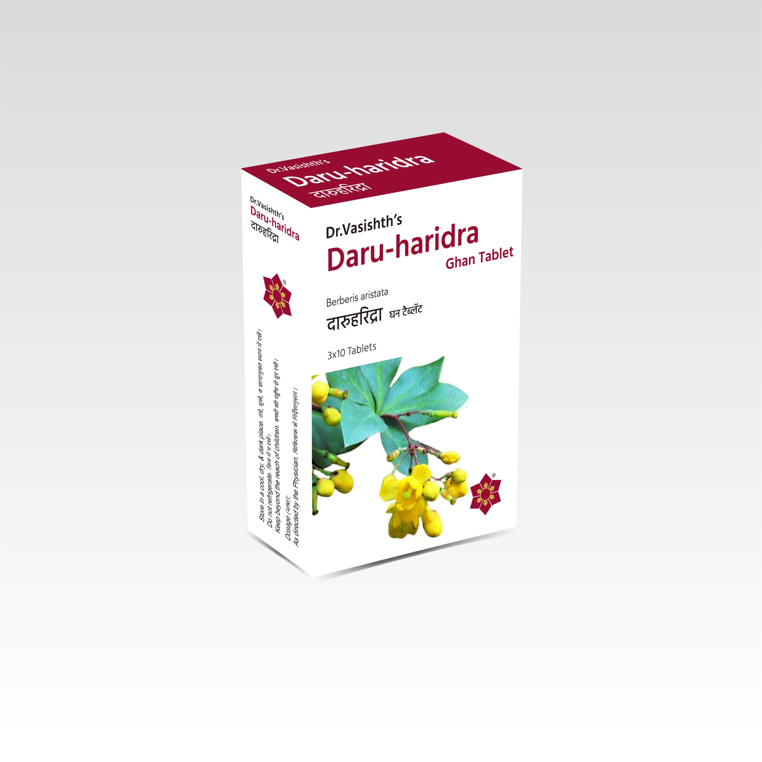 | Dosage & Usage: | Each Daru-Haridra Ghan Tablet contains 600 mg ghan (Extract), derived from 3 grams of Daruharidra Churna. Recommended dosage of Daru-Haridra Ghan Tablet is, 1-2 tablets, 3-6 times a day, depending on disease severity and patient body weight. |